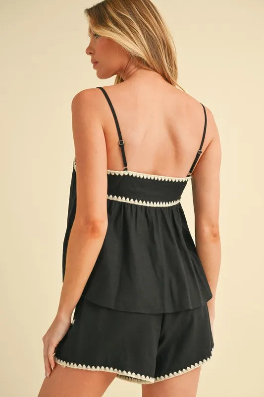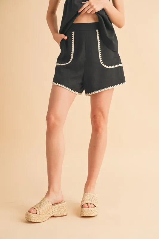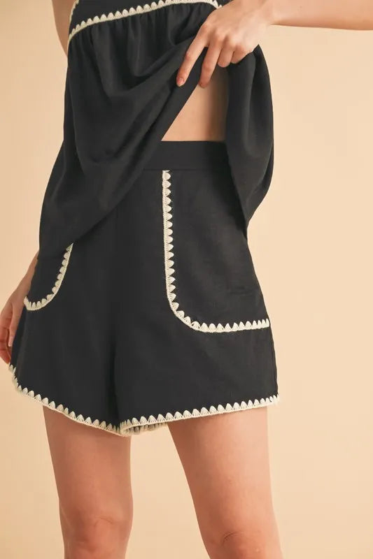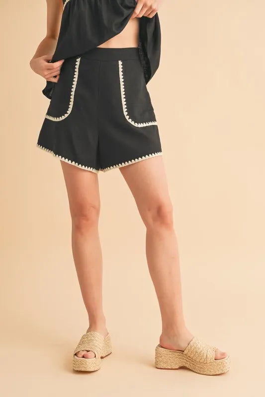 Rickrack trim shorts are shorts that are decorated with rickrack trim along the hem or seams. Rickrack trim is a zigzag or wavy patterned trim that adds a playful and retro touch to the shorts. These shorts are perfect for adding a fun and decorative element to your summer wardrobe, making them a stylish and eye-catching choice for warm weather outfits.