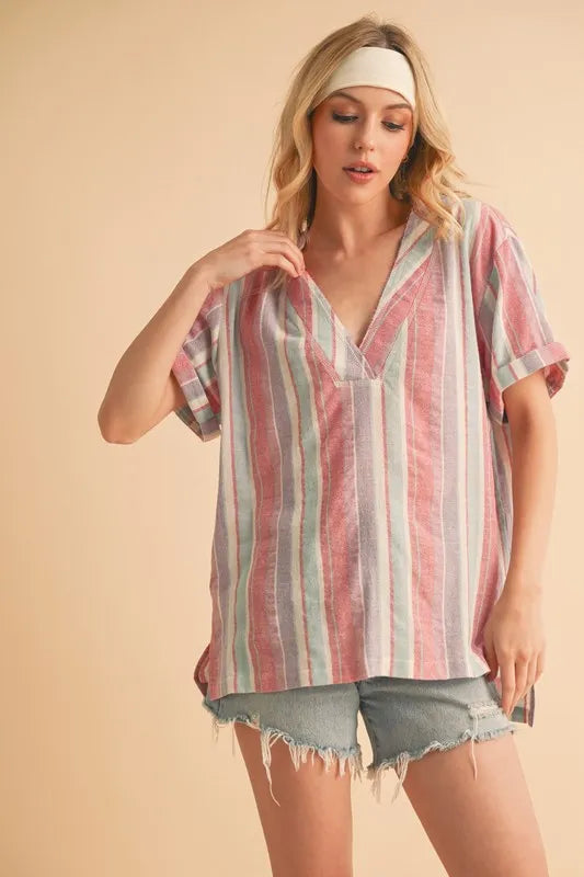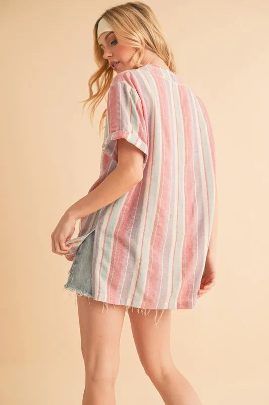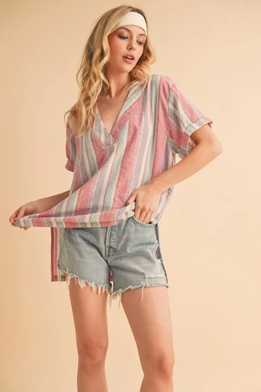 Aemi+Co Side Slit Striped Short Sleeve Blouse