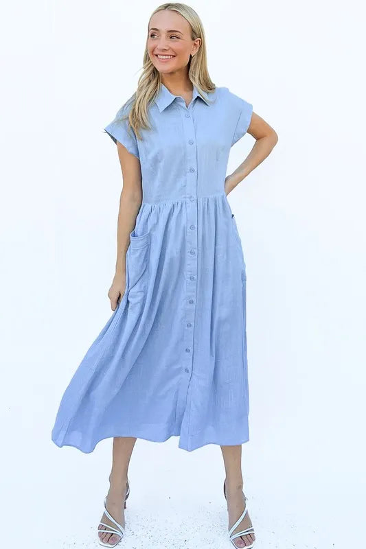This shirt dress features cap sleeves and front pockets for a stylish and practical look. The cap sleeves provide a flattering touch while the front pockets add both functionality and trendy detail to the dress. Perfect for a casual day out or a relaxed outing, this shirt dress is versatile and chic, offering a comfortable and fashionable option for various occasions.