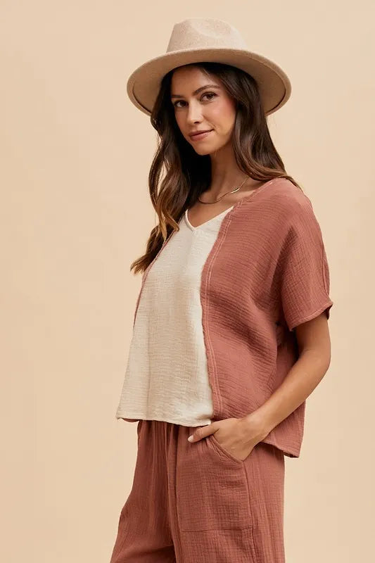 The color block cotton gauze V-neck top is a lightweight and airy piece that combines different hues for a stylish look. Made from breathable cotton gauze fabric, this top offers comfort and a relaxed fit. The color block design adds visual interest and a modern touch to the classic V-neck style. Pair it with shorts or jeans for a casual and chic outfit that is perfect for warm weather days.