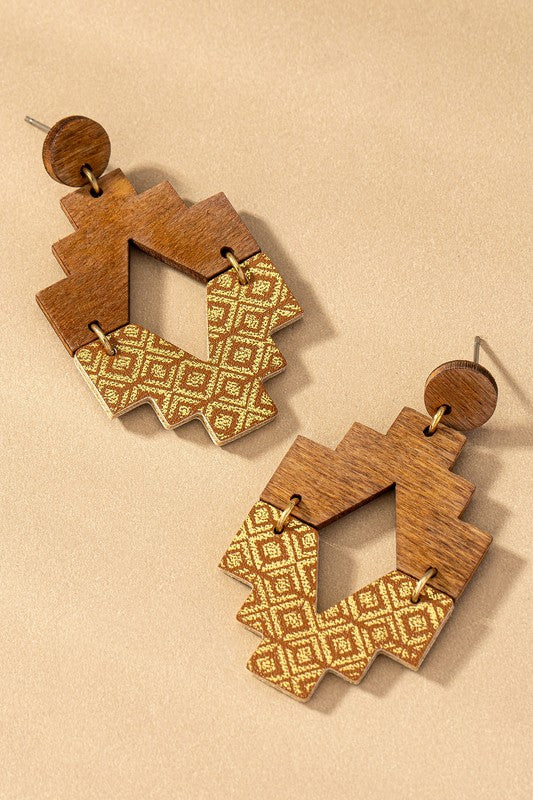 Geo shape half wood half leather drop earrings. Made of wood and pvc with gold pattern printed. Very lightweight.