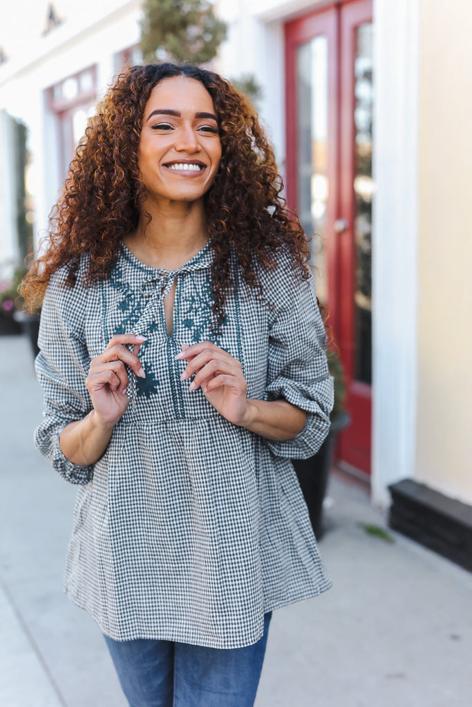 Turn up the boho vibe with this plaid front keyhole tie blouse donned with stunning dark green embroidery. With long elastic bubble sleeves and a back neck button, this light-weight top is a perfect transitional piece to early spring.