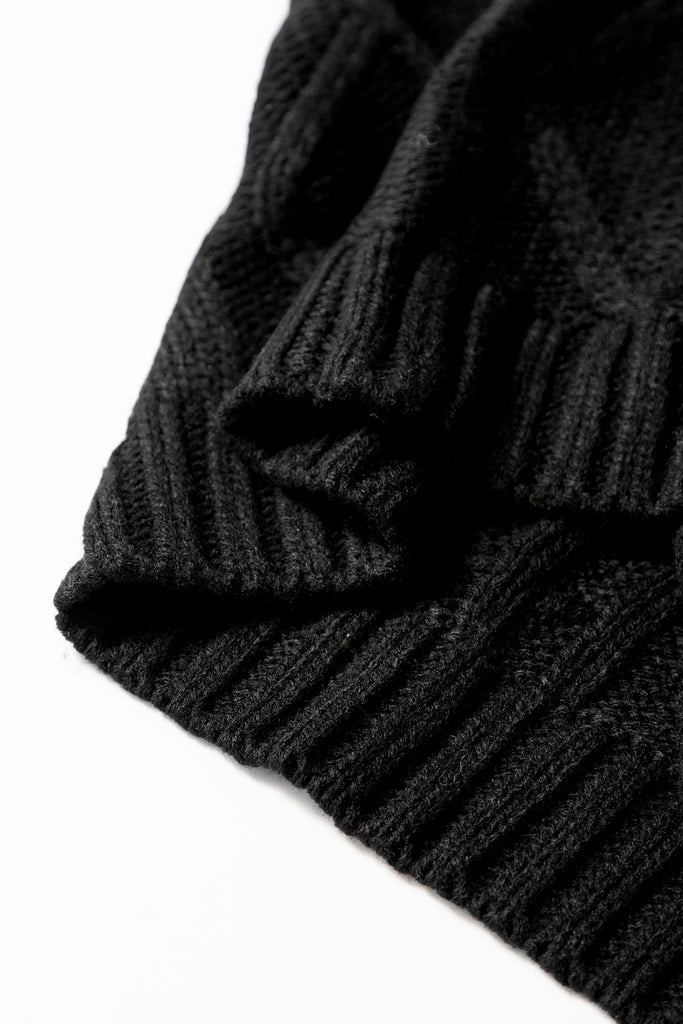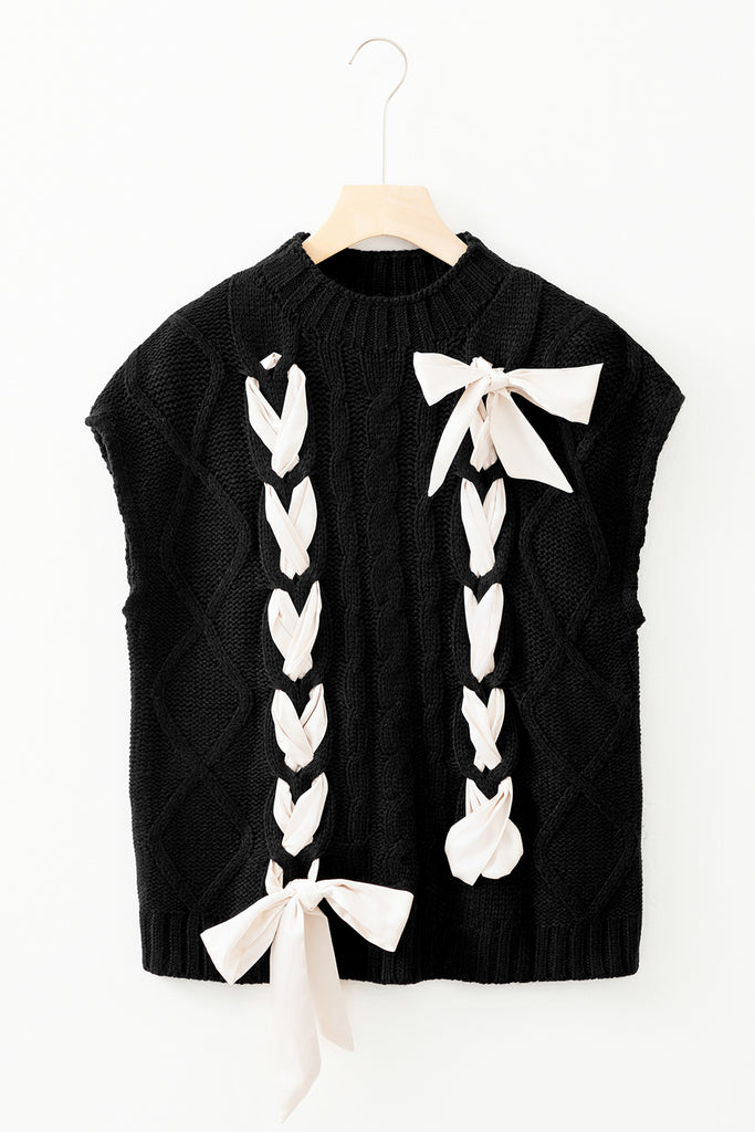 Black Cable Knit Colorblock Satin Bowknot Short Sleeve Sweater