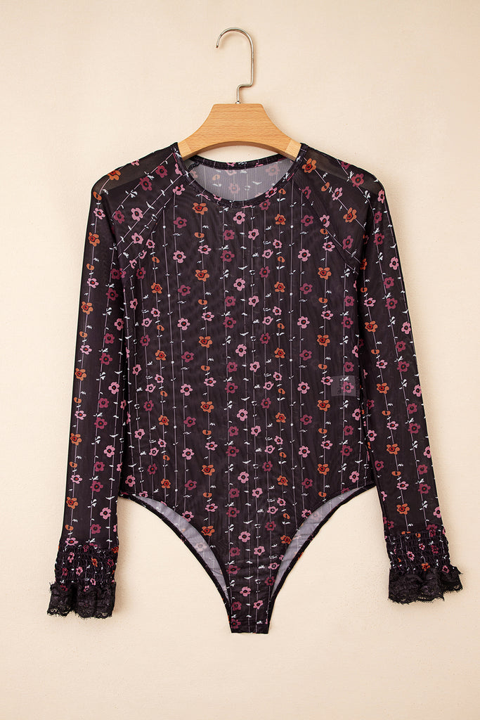 Black Floral Print Smocked Cuff Slim Fit Mesh Bodysuit