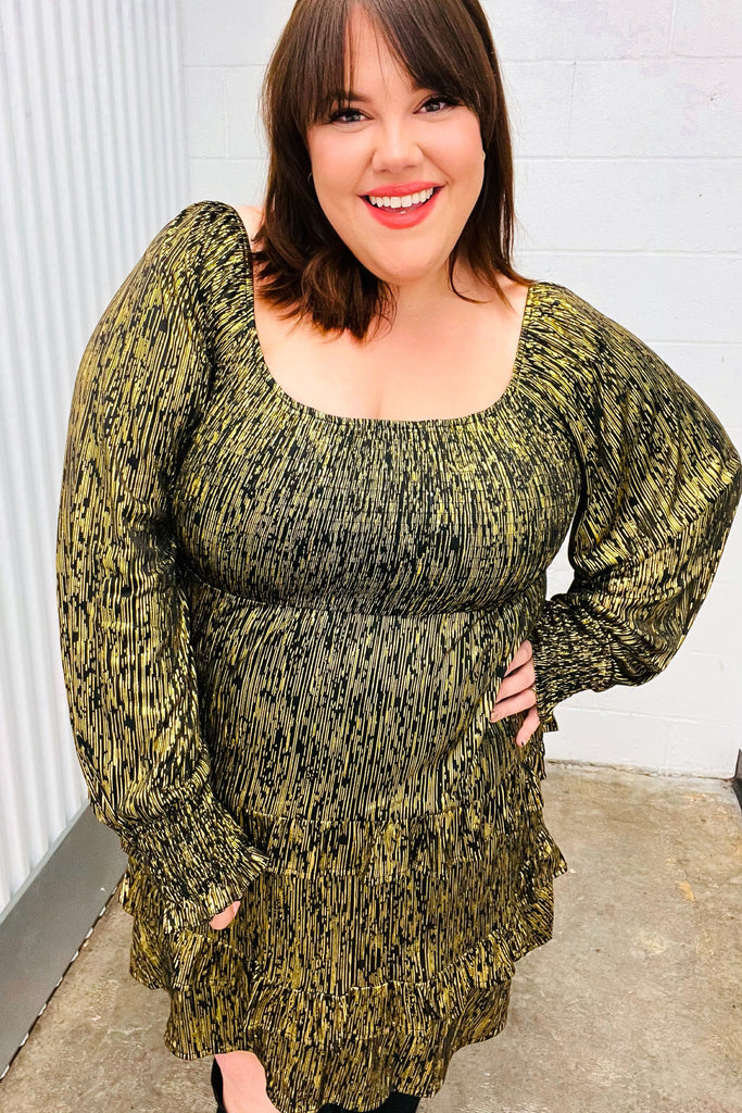 Get holiday party ready with this smocked chest gold foiled dress. Smocked cuff bubble sleeves and tiered ruffle design complete this stunner!