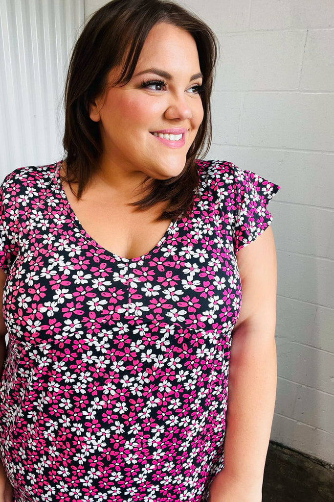 Black Multicolor Floral Babydoll Flutter Sleeve Midi Dress