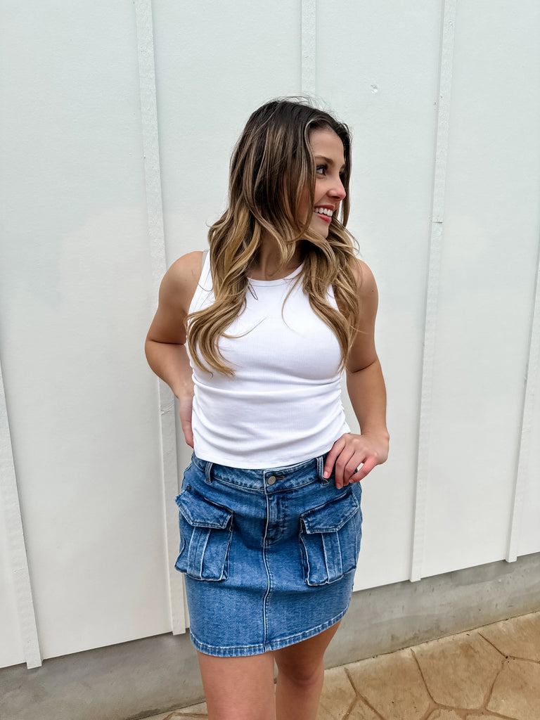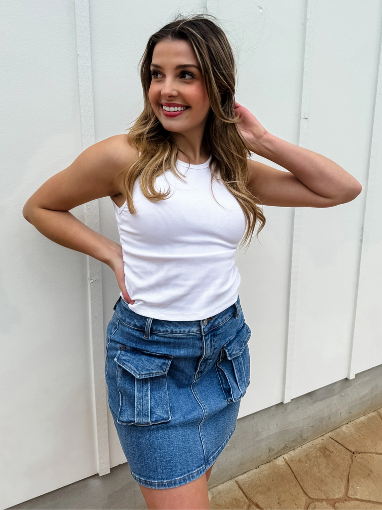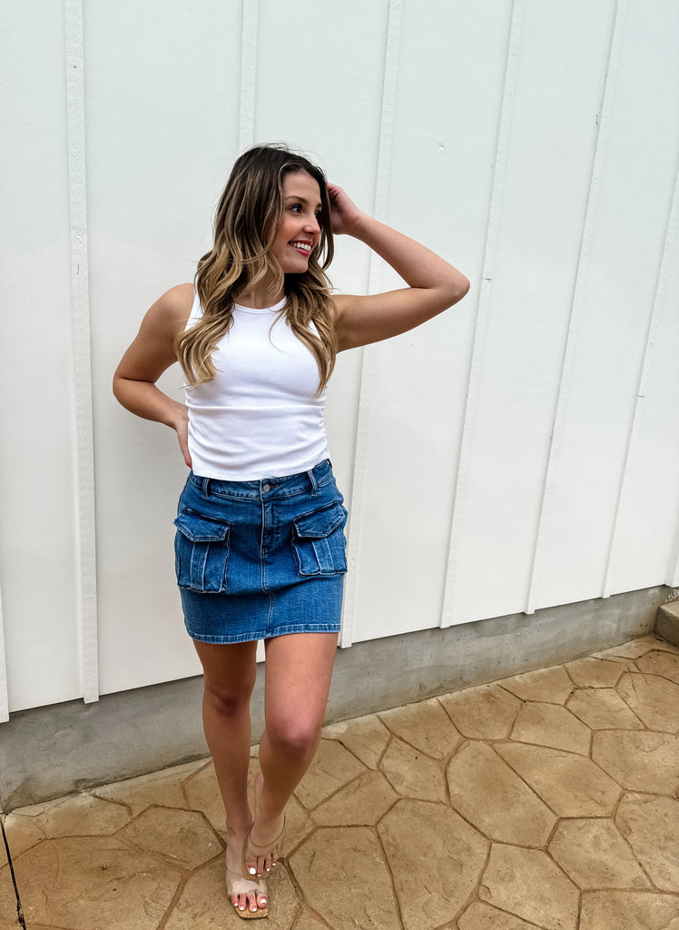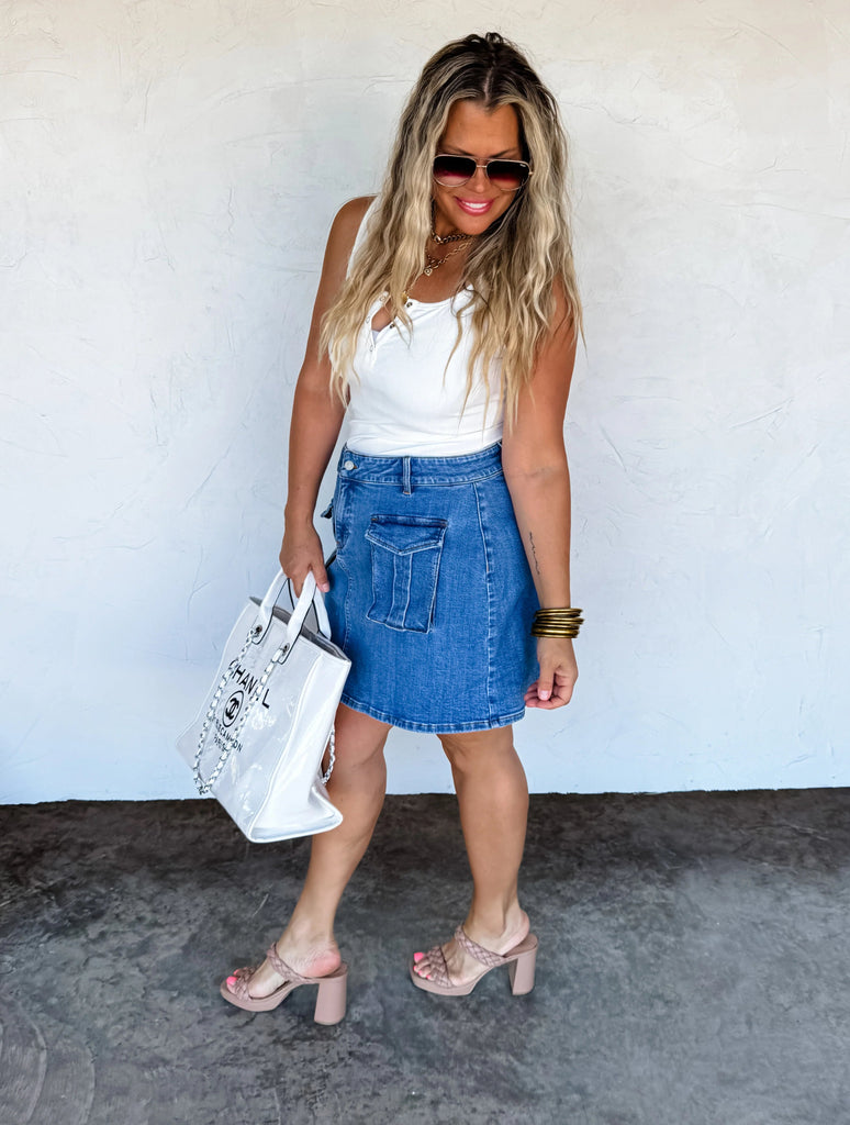 You're perfect Summer denim skirt is here! Made in a cargo front pocket style, this skirt features faux back pockets, amazing stretch and belt hole loops.