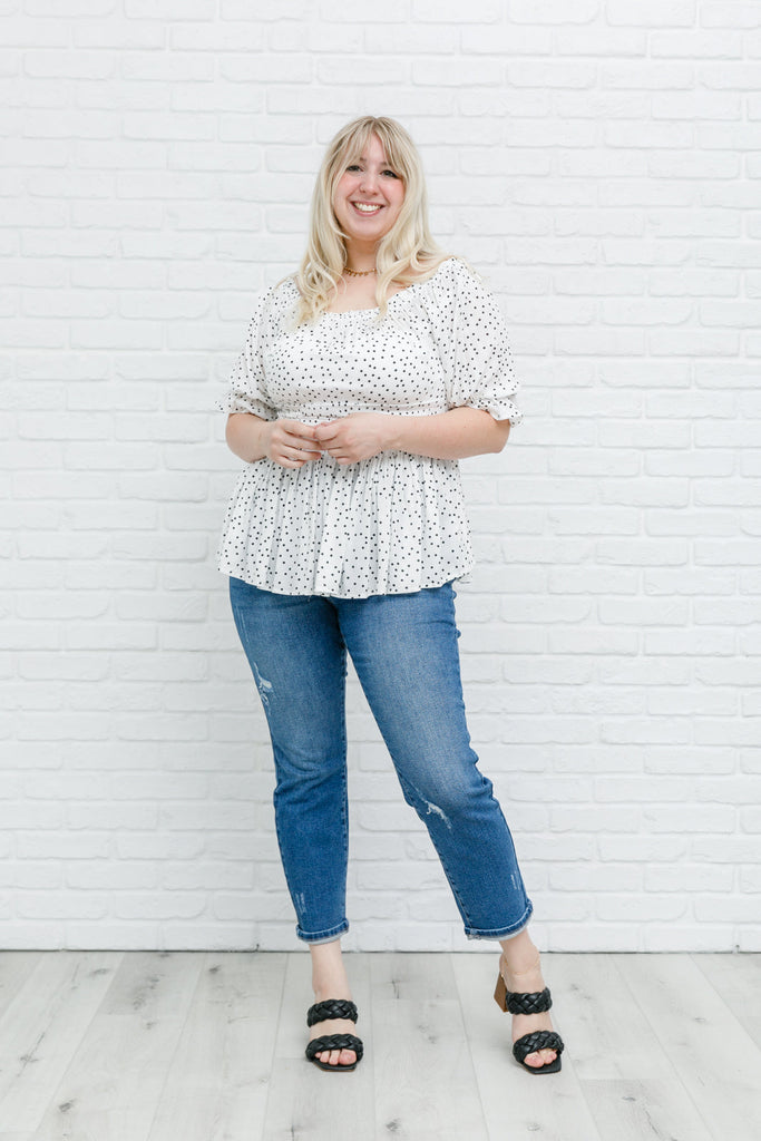 It's all in the details with the Chose Me Dotted Top! Consisting of an elastic off shoulder silhouette, detailed in a ruffle hem, that flows into three quarter sleeves, with elastic ruffle cuffs, shirred waistline, and peplum style bodice. Keep it chic with black skinnies and heels or pair this with light wash distressed denim and sneakers for a casual cool girl look!