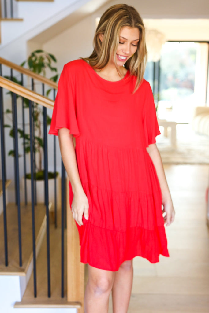 Get ready for warmer weather with this stunning solid red midi length dress that features a three-panel tiered design and stunning flutter sleeves. A keyhole back button clasp and a babydoll style complete this flattering dress.