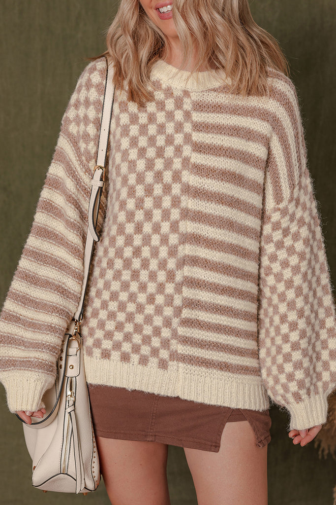 Khaki Stripe Checkerboard Drop Shoulder Balloon Sleeve Sweater