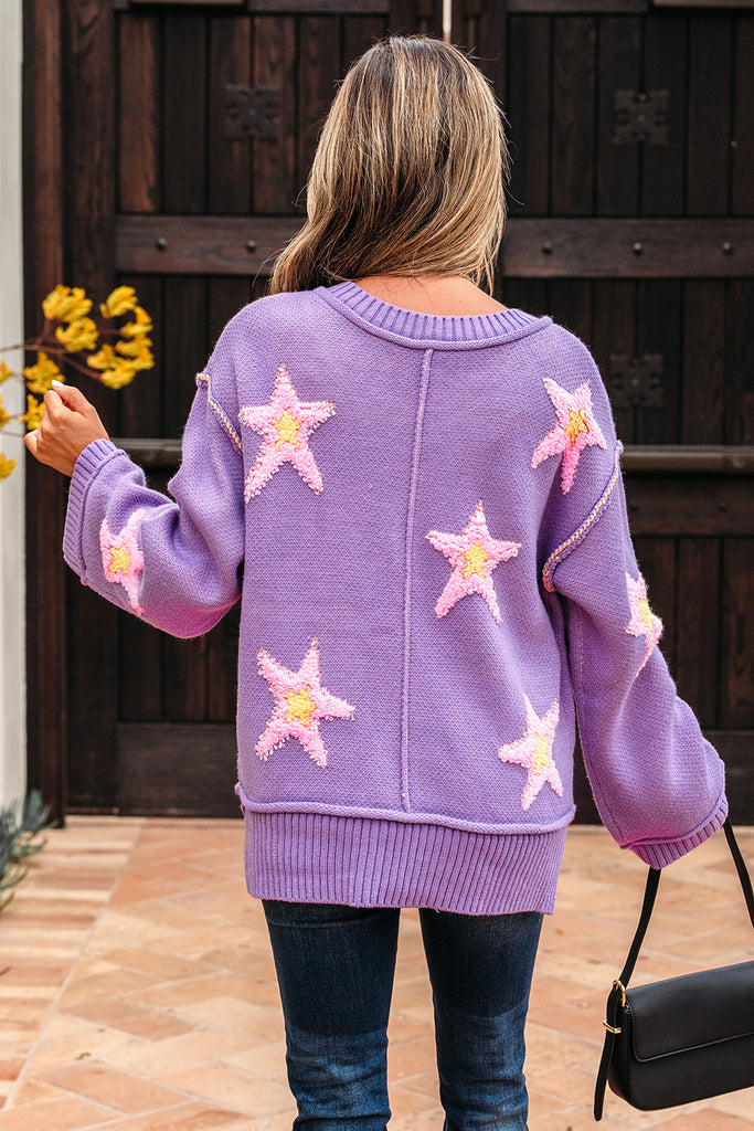 Lavendula Brushed Star Graphic V Neck Drop Shoulder Oversize Sweater