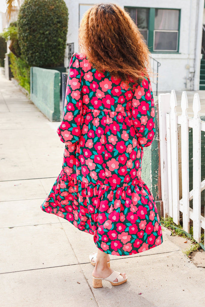 Look more than adorable in this vibrant coral and fuchsia floral tiered maxi dress featuring trendy ribbon bow ties, side pockets and flattering long elastic bubble sleeves.
