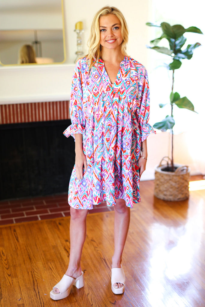 Step out in style wearing this multicolor ikat print woven dress. With a V neck, elbow length ruffle hem sleeves, this dress packs in a lot of fashion. Pair with your fav cowboy boots or flats.