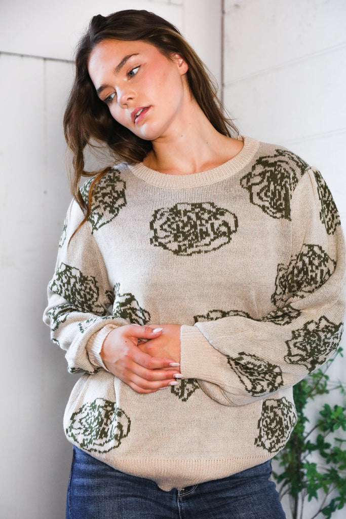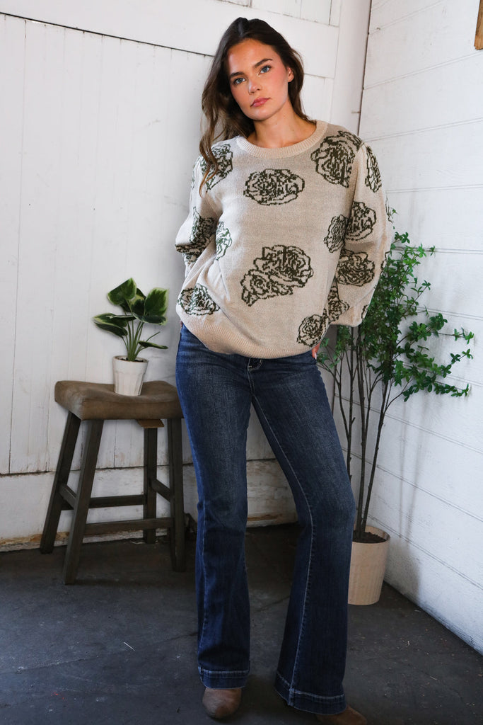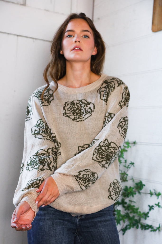 This sweater is just the right mix of cozy and fun. The soft oatmeal knit is scattered with olive rose designs that give it a sweet but playful vibe. It’s got a relaxed fit with ribbed cuffs and hem, so it hangs just right over jeans or a cute skirt. The fabric feels super soft. It's the perfect weight to layer under a coat on those extra cold days.