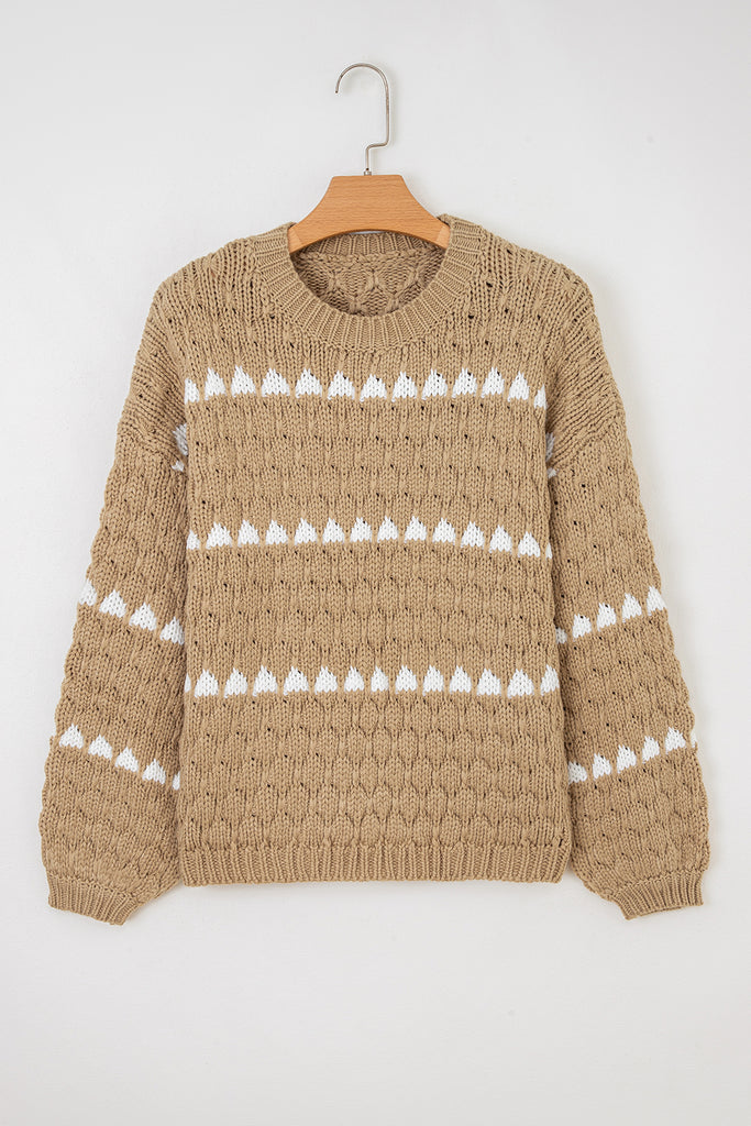 - Stylish contrast detailing enhances the textured knit for a chic look.