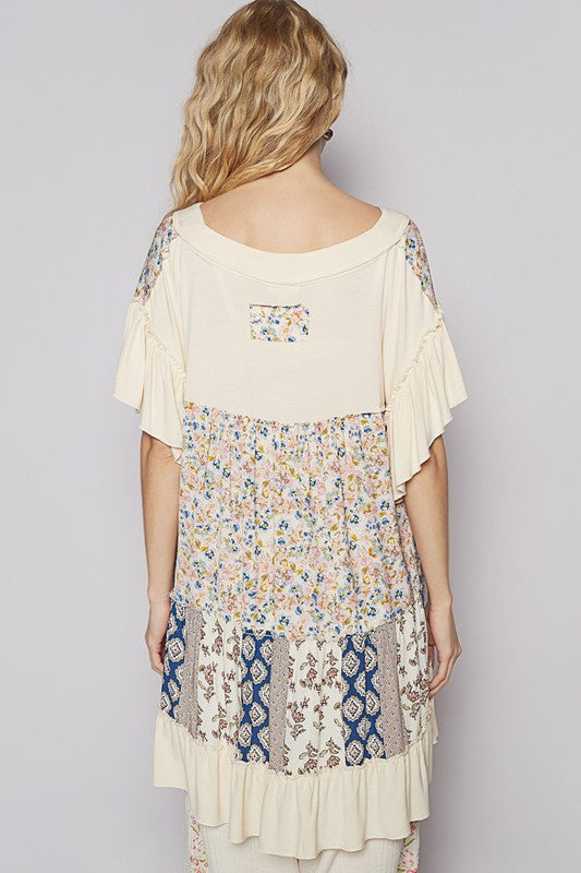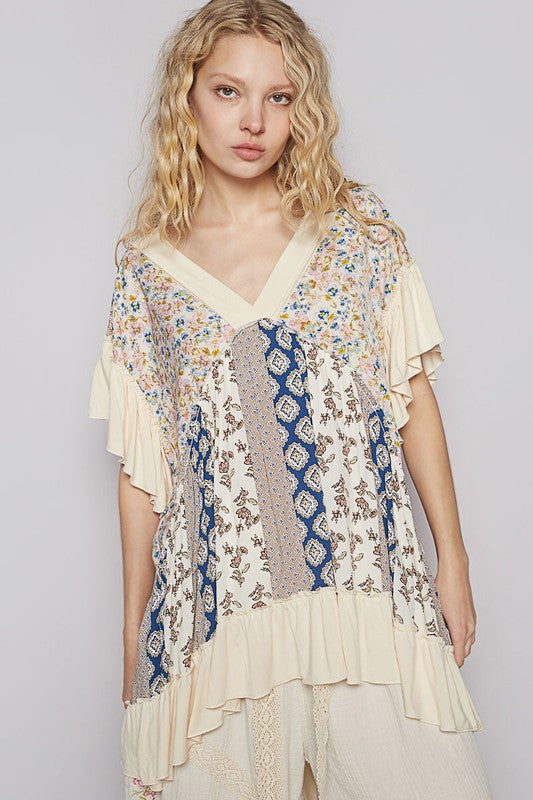 POL Ruffled Hem Printed V-Neck Short Sleeve Blouse