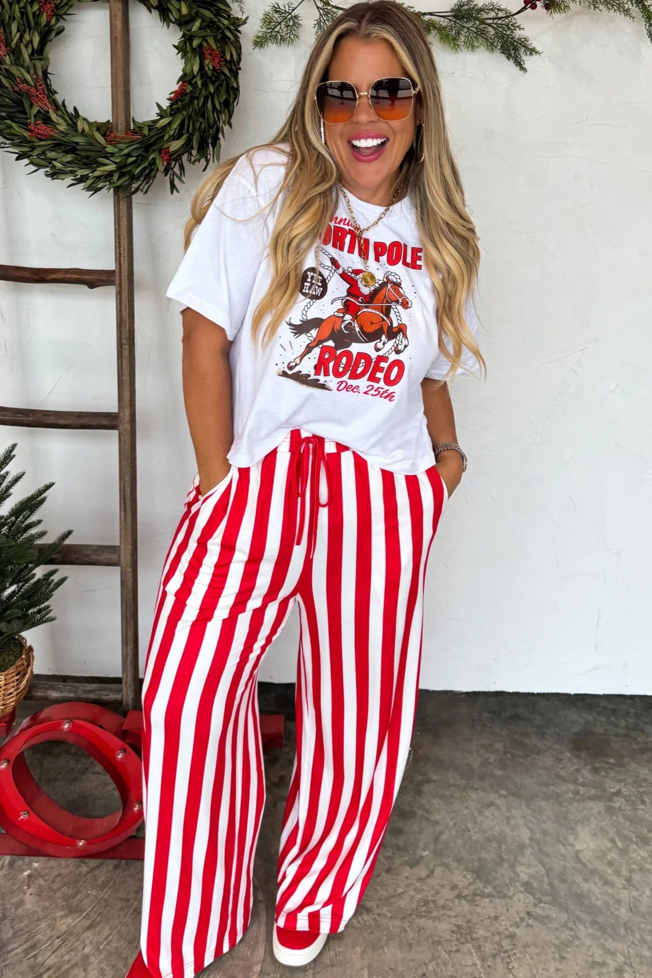 Cloud soft and so so stretchy! These stripe pants are the perfect way to add a "pop" to any outfit!! Features side pockets, wide legs and elastic waist with faux drawstring.  Perfect for holiday lounging, pajama parties, or pairing with your favorite festive graphic tee.