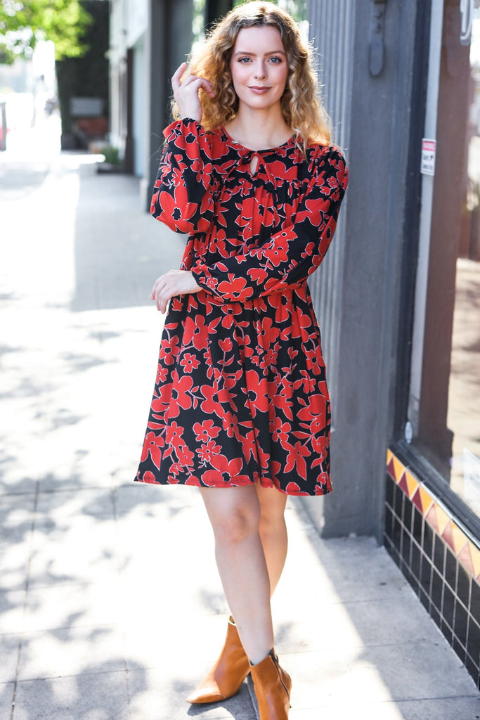 Boldly You Rust & Black Floral Print Front Tie Dress