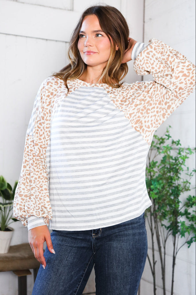 This top is so much fun! A mix of our two favorite details, stripes and animal print! There are reverse seams throughout which give it something extra. The fabric is very soft and there is a decent stretch.