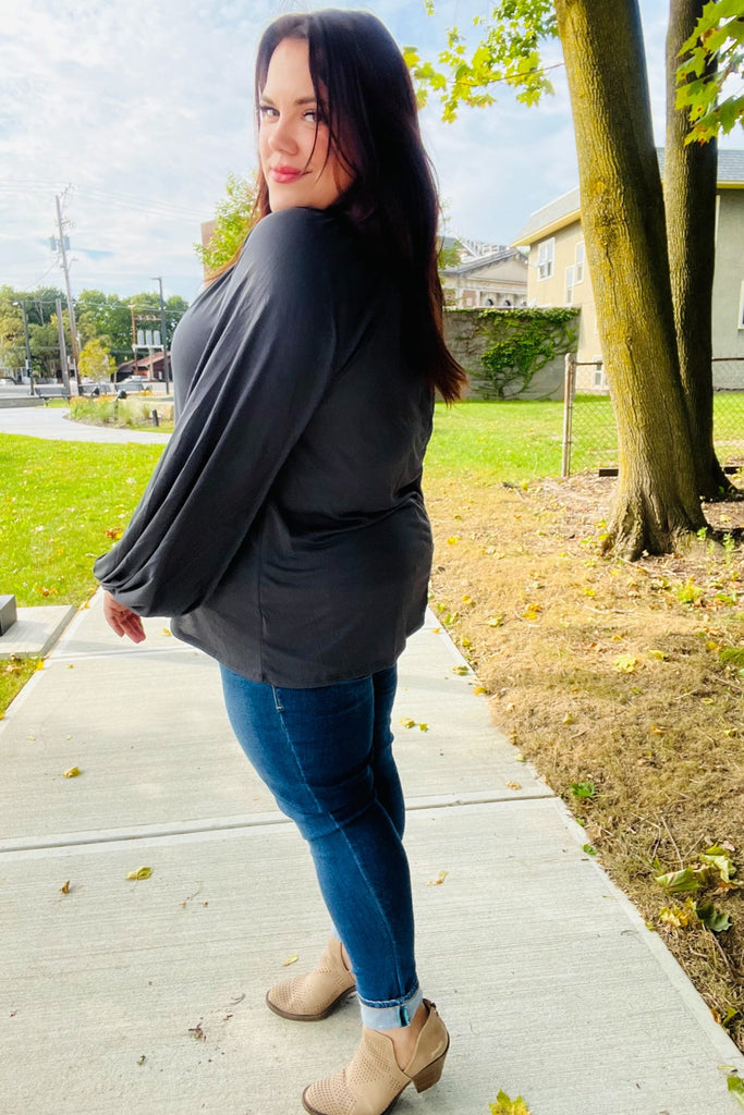 Versatile Charcoal Front Tie Modal Knit Peasant Top